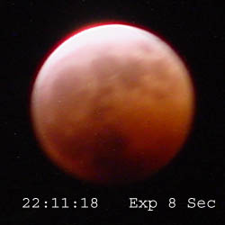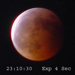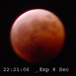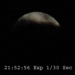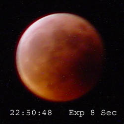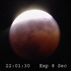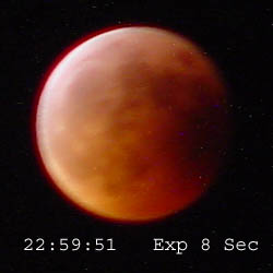 The following images were taken at approximately 10 minute intervals during the eclipse using a Sony Mavica CD–1000. All times are CDT. Location was N43º 06´ 41“ – W91º 52´ 59“. There were thin clouds during most of the evening which masked details. Also, I believe there was some bluring due to motion of either the camera, the moon, or both during the longer (8 sec.) exposures.
