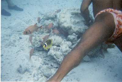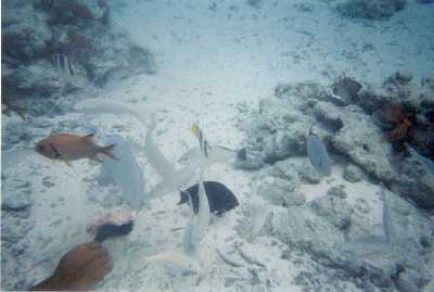 This ray was about 3 feet across. He seemed very curious and swam quite close to everyone. I don't know the species of this one but we were told it was not dangerous. |