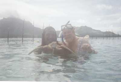 | Here I am with one of the Lagoonarium guides and the sea turtle. |