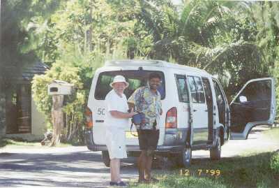 The tour van and the driver who took us around Bora Bora. There is only one road (about 20 miles long) that follows the perimeter of the island. You can see something that looks like a mailbox at the left of this picture. In fact, it is a bread box that the local bakery uses for delivery of fresh bread twice a day. (There is no mail delivery.) |